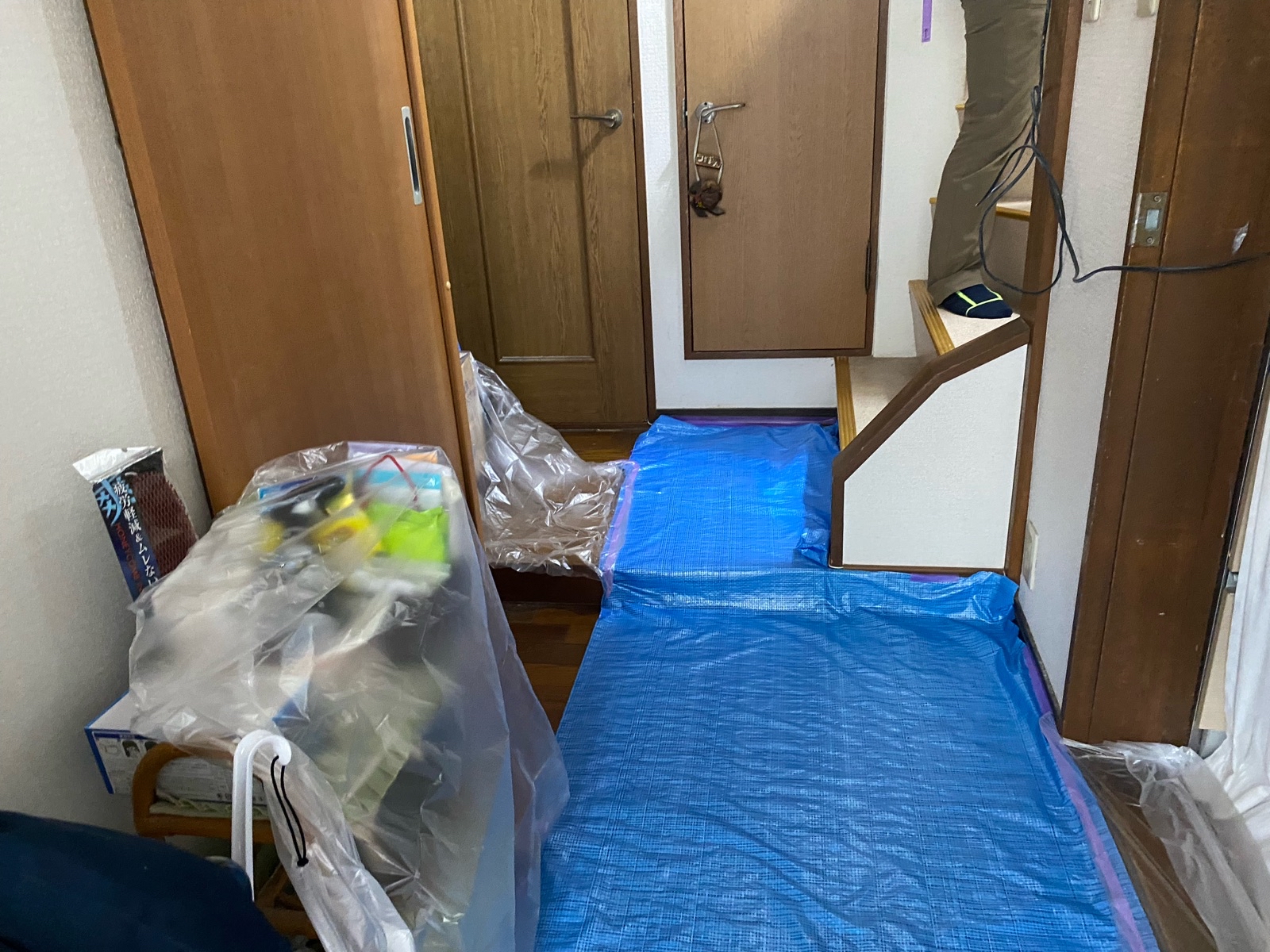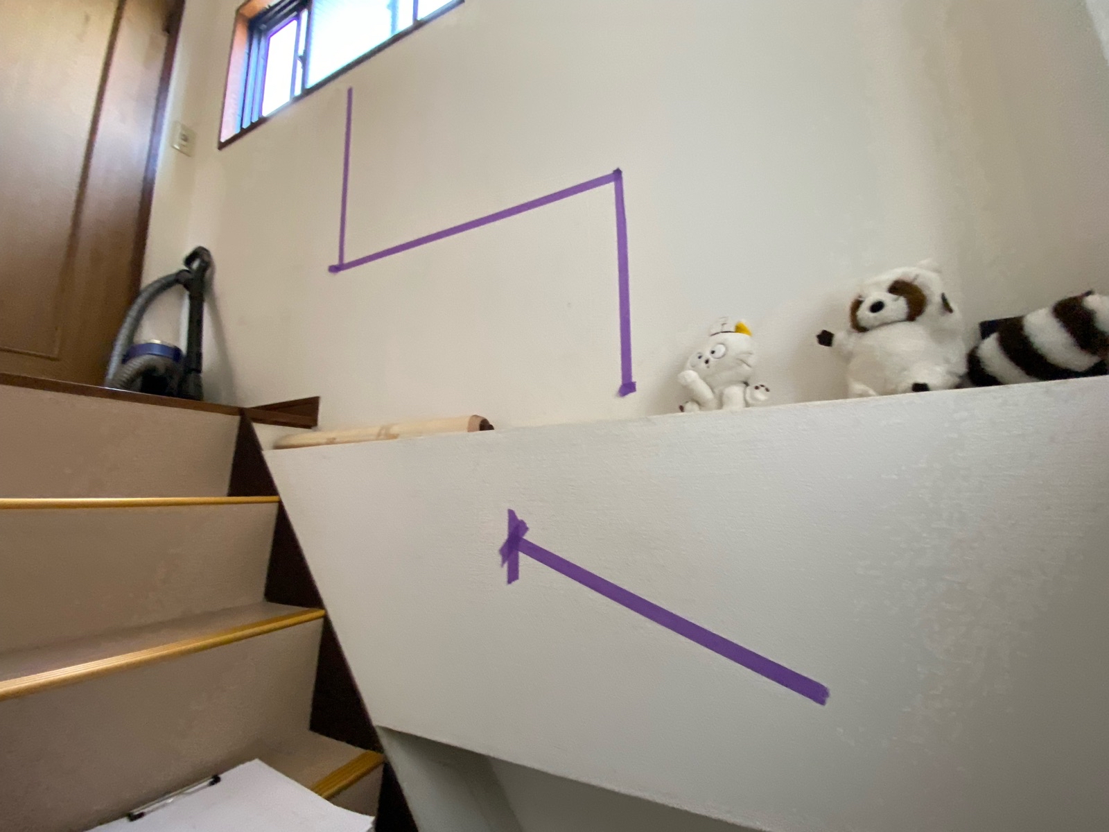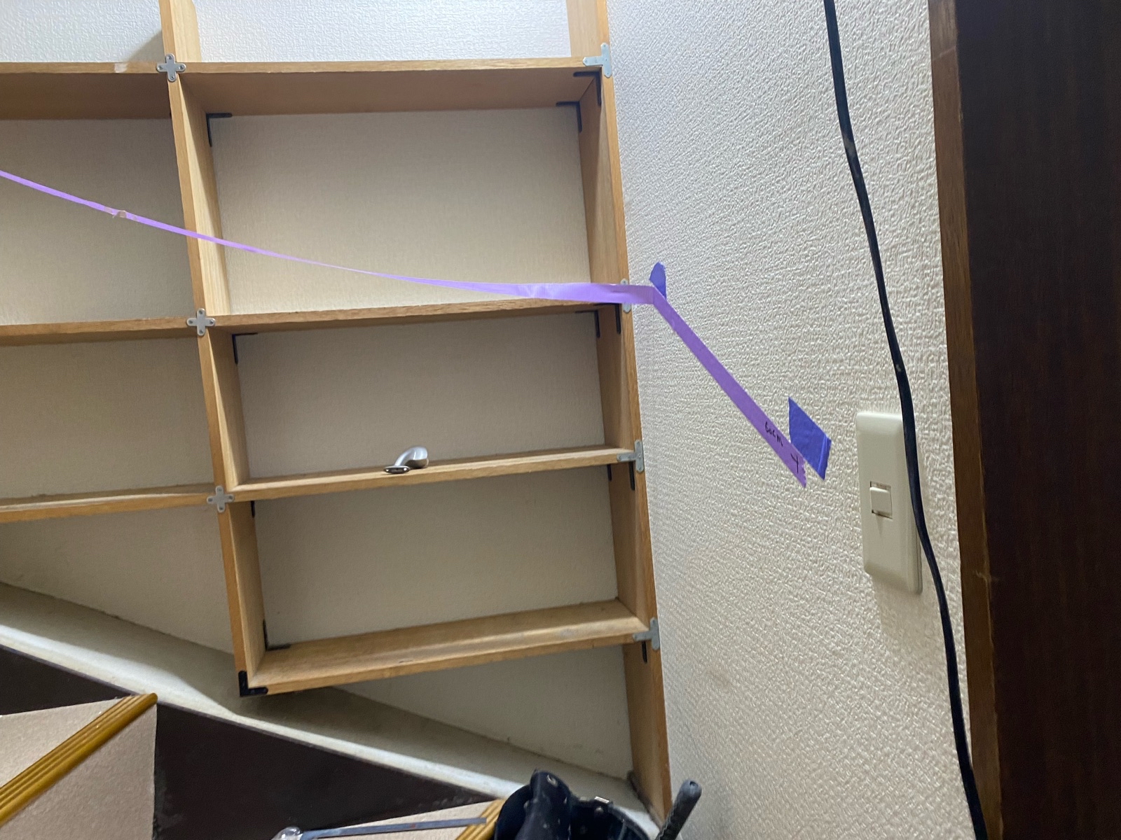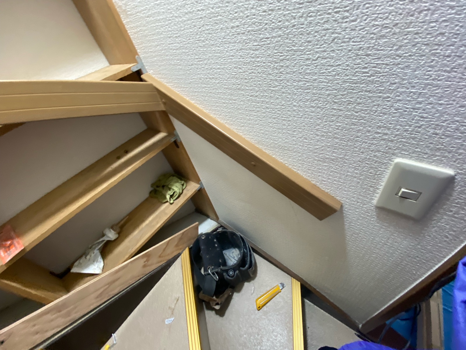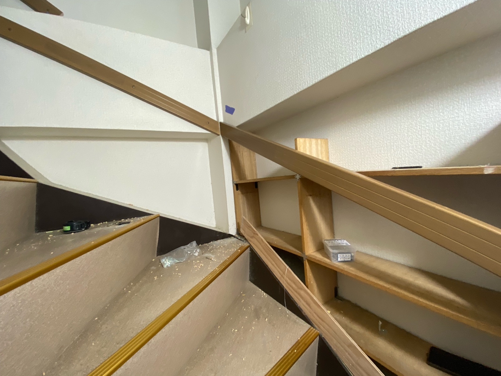 階段に手すりが無かったので上り下りが大変になってきたご家族の為、階段に手すりの取り付けをご依頼いただきました。本棚が壁面にあるので取り付けスペースに限りがありましたが、既製品の手すりを下地板に固定することで体重を支えながら上り下りできるようになりました。